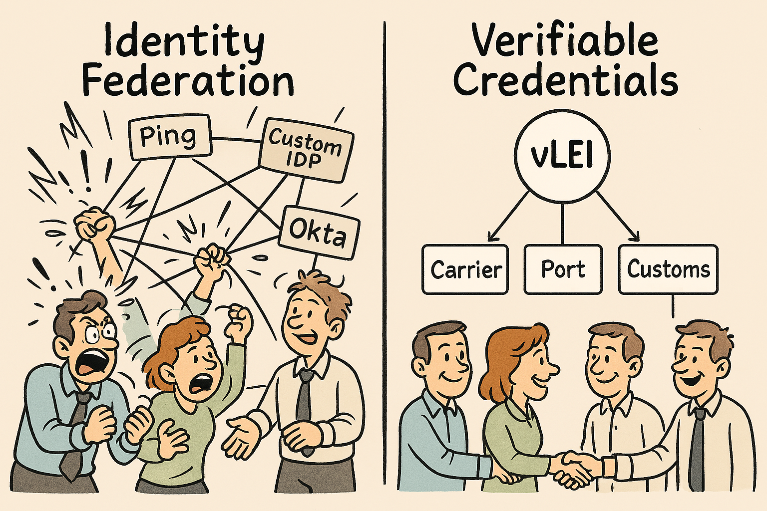 In multi-party trade flows, every participant relies on its own IAM stack with a different Identity Provider (IdP) – Okta here, Ping there, Entra ID somewhere else, sometimes Auth0 or bespoke stacks.